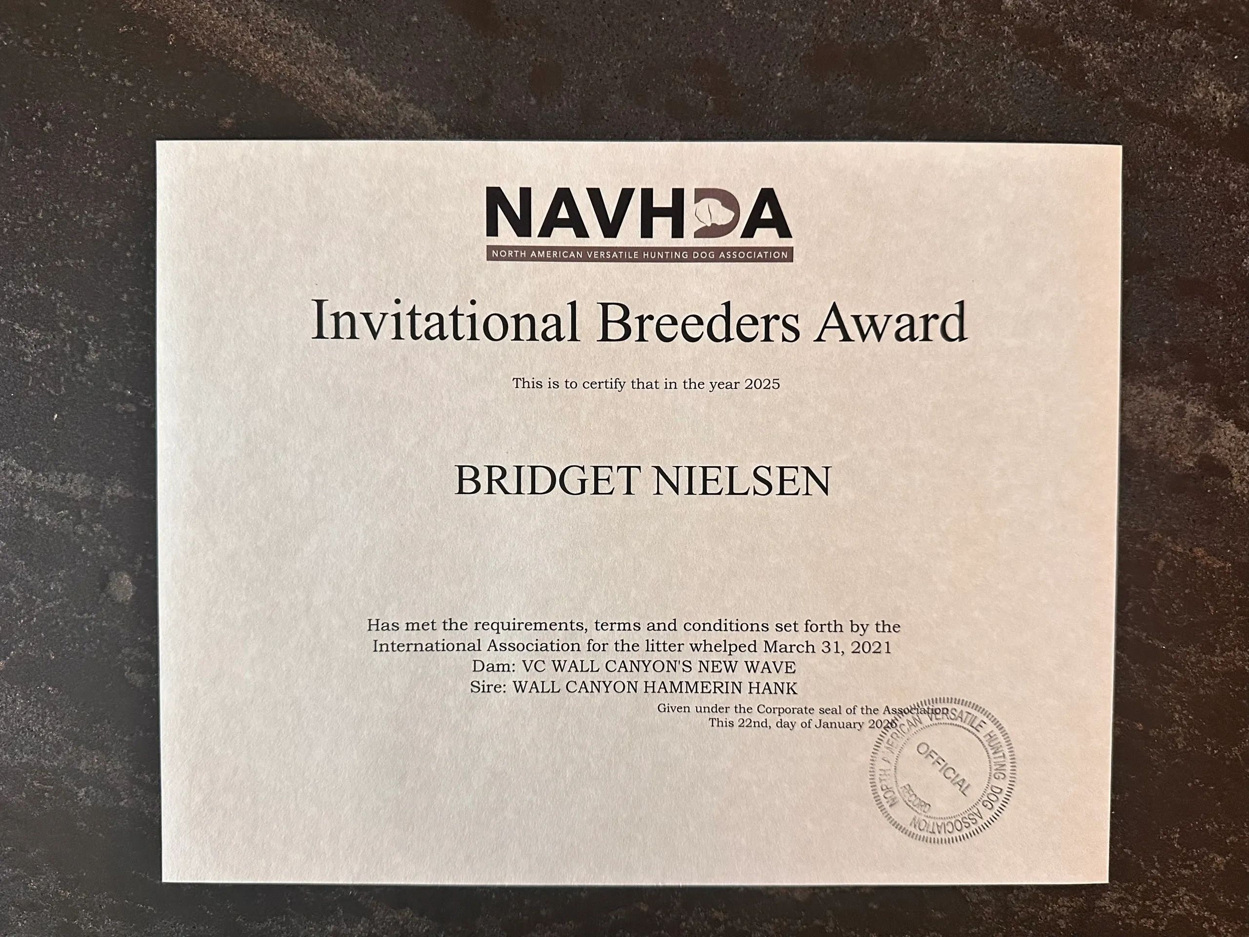 NAVHDA'S NEWEST INVITATIONAL BREEDERS AWARD FOR VIZSLAS